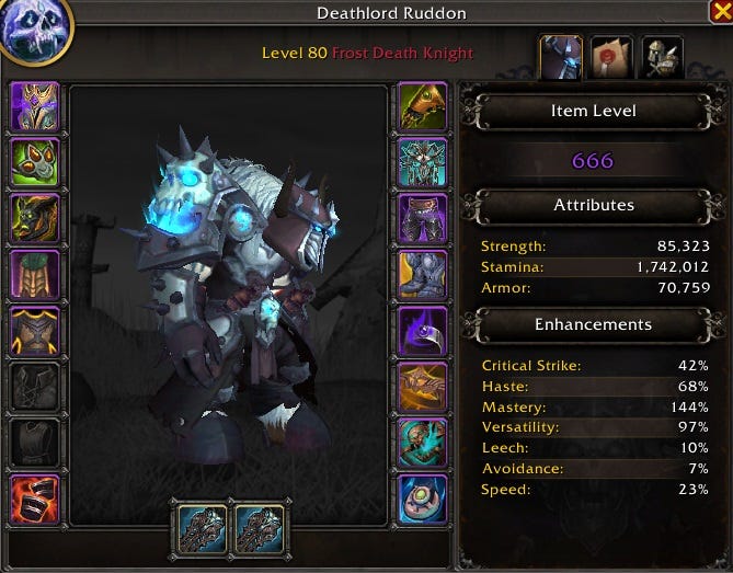 In Legion Remix, the secondary stats are hard-capped at your ilvl, and most of your power comes from “Limits Unbound,” which increases your versatility and stamina. Versatility is great for stacking damage, healing, and damage mitigation, so it makes sense it’s the secondary stat of choice to level up, but other than just whalloping an enemy for 100million damage, there wasn’t anything beyond just seeing how high you can climb. No massive increases to speed, zooming around the map, no overpowering avoidance so you become a PvP dueling god and can solo Mythics, no stacking crit to a ridiculous degree that you can fist bump God to death. Just a cycle of increasing Limits Unbound, and that’s really it.